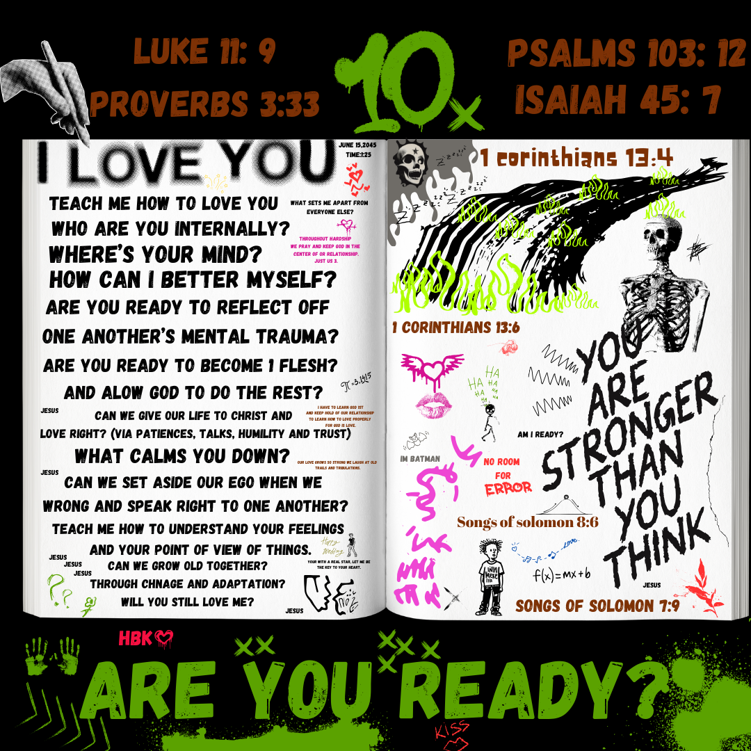 Deep questions from a Man to His soon to be wife. As he dabbles and goofs off via drawing and scribbling and writing Bible verses as he thinks deeply about his Love for his women and how he wants to live life right with her forever, through a Godly relationship with joy, honor and true Love.